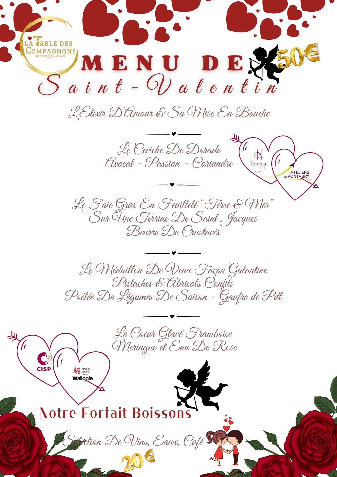 Pour tous les amoureux, voici notre menu de Saint-Valentin qui sera servi le vendredi 13 février à midi et au soir.