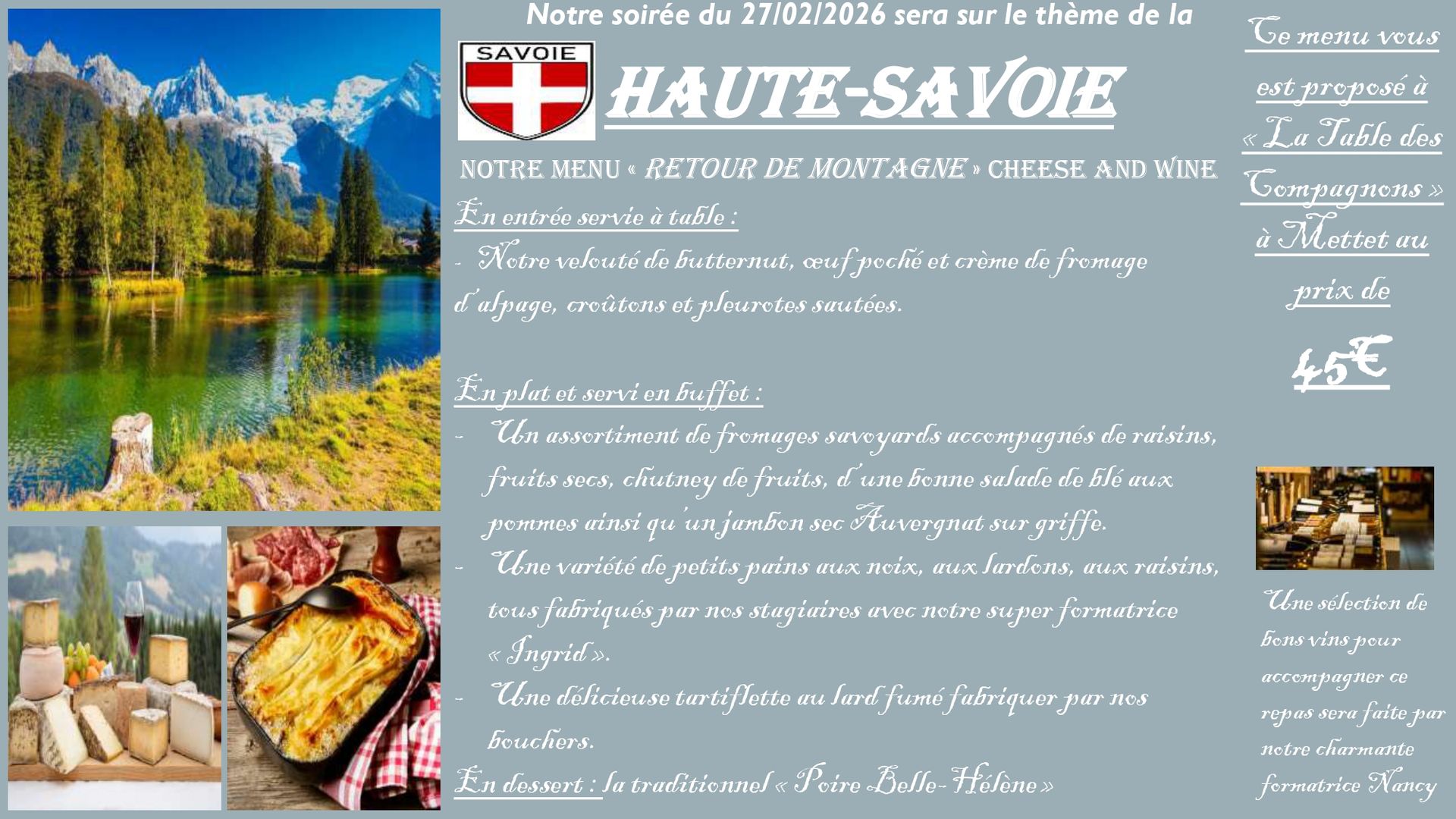 Après le succès de notre soirée thaïlandaise en janvier, voici pour fin février notre soirée "Savoyarde" inspirée par notre duo de choc Patrick, notre formateur en cuisine et Nancy, notre formatrice en salle. Réservez vite !!!